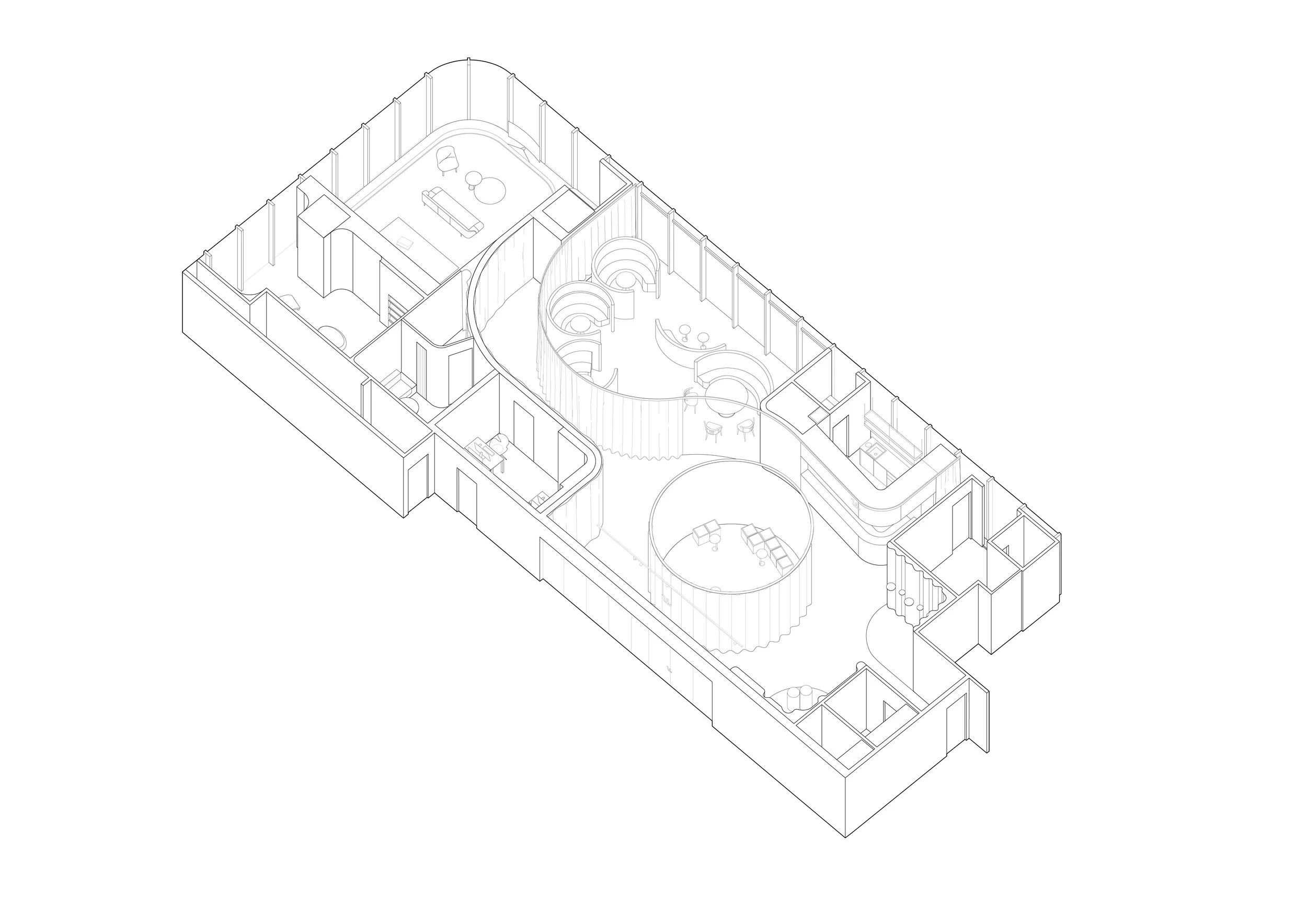 The entrance reception features a circular theater enclosed by leather curtains; its terrazzo steps serve dual purposes—waiting seating for guests or a venue for salons and lectures.